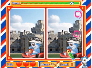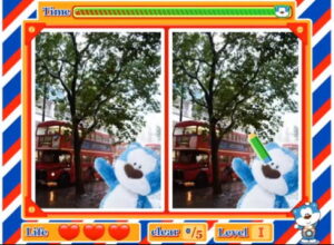 세계여행을 하고 있는 블루베어가 오늘은 영국 편으로, 두 개의 그림에서 서로 다른 부분을 찾아내는 임무를 가지고 게임이 진행됩니다.