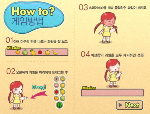 - 🖱️ 미션을 진행할 때 마우스로 과일을 선택하고 스페이스바로 먹기/힘 모으기를 실행해야 합니다. 가장 초반에는 단순하게 2개나 3개의 과일로 시작합니다.