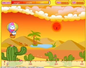 게임이 시작되면 마우스를 클릭하여 기구를 높이 띄웁니다. 공중에 둥실둥실 떠다니는 구름과 지상에 있는 선인장, 그리고 뾰족한 부리로 공격해 오는 새는 모두 장애물로 간주합니다. 이들과 부딪히지 않고 목적지까지 무사히 이동해야 합니다.