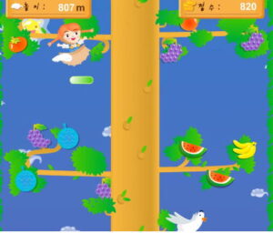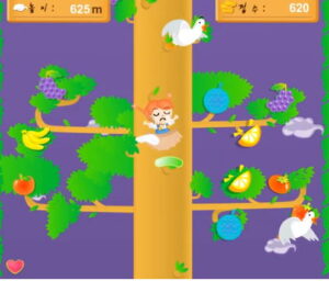 먼저 이 게임의 스토리와 플레이 방법을 설명하자면, 하늘 위쪽으로 점프를 통해 하늘나무에 올라가 맛있는 열매를 따는 작업을 시도하는 재미있는 작품입니다.