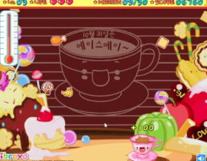아주 귀엽게 생긴 커피잔이 하나 준비되어 있는데, 플레이어는 해당 캐릭터를 가지고 좌우로 이동시키며 하늘에서 떨어져 내리는 과자 에이스를 열심히 받아내야 합니다.