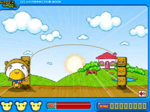 이 게임의 조작 방식은 화살표키와 스페이스바를 이용하면 되는데, 먼저 두더지처럼 생긴 여섯 마리가 양옆으로 나눠 줄넘기를 열심히 돌리고 있어요.