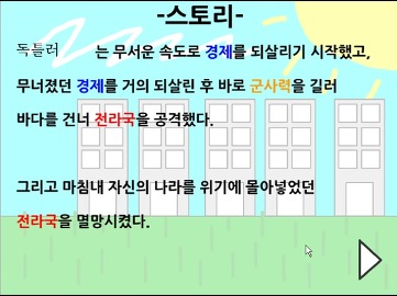 우선 새로운 나라 이름과 여러분의 닉네임을 정하는 것부터 시작해 보세요. 현재 우리에게 남은 곳은 오직 제주도뿐! 이곳에서 다시 부활을 꿈꾸며 군사를 키우고 경제를 발전시키는 것이 최우선 과제입니다.